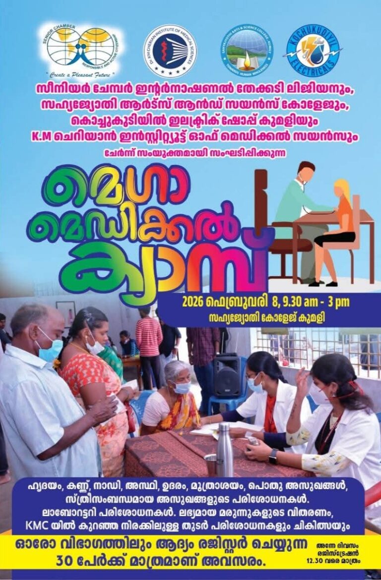 കുമളി: സീനിയർ ചേംബർ ഇൻ്റർനാഷണൽ തേക്കടി ലീജിയൻ്റെ നേതൃത്വത്തിൽ കുമളിയിൽ സൗജന്യ മെഗാ മെഡിക്കൽ ക്യാമ്പ് സംഘടിപ്പിക്കുന്നു. ഫെബ്രുവരി 8 ഞായറാഴ്ച കുമളി സഹ്യജ്യോതി ആർട്സ് ആൻഡ്...