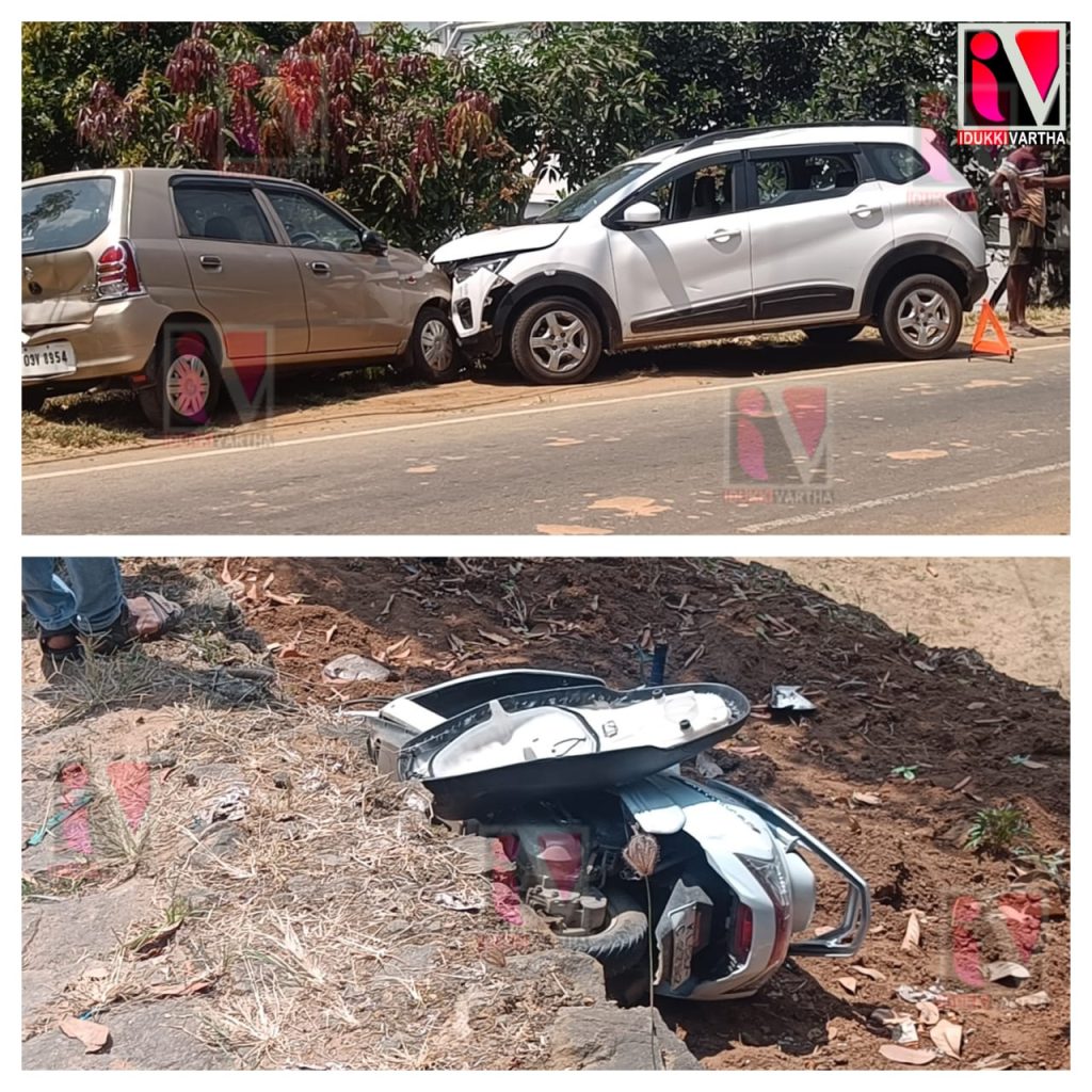കുമളി വലിയകണ്ടത്തിന് സമീപത്ത് വെച്ചാണ് അപകടം ഉണ്ടായത്. കുമളി ഭാഗത്തേക്ക് വരികയായിരുന്ന കാർ എതിർ ദിശയിൽ വന്ന സ്കൂട്ടർ ഇടിച്ച് തെറിപ്പിക്കുകയായിരുന്നു. ഇടിയുടെ ആഘാതത്തിൽ ബൈക്കു യാത്രക്കാരനും ബൈക്കും സമീപത്തെ കുഴിയിലേക്ക് പതിക്കുകയായിരുന്നു.