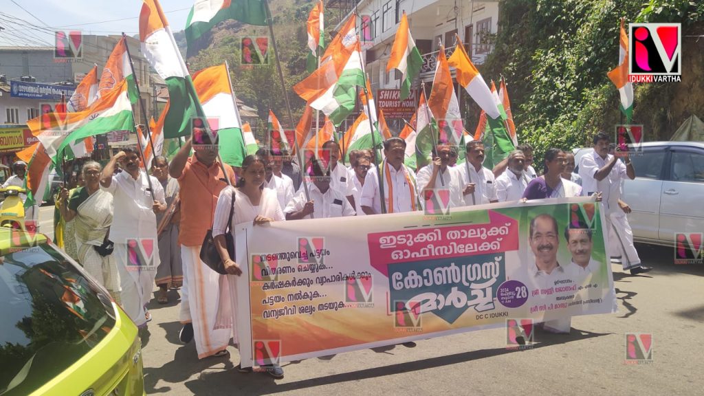 3500-ൽ അധികം പട്ടയം തടഞ്ഞുവച്ച സർക്കാർ നടപടികൾക്കെതിരെയും വന്യമൃഗശല്യം മൂലം ജനങ്ങൾ മരിച്ചു വീഴുമ്പോഴും നാമമാത്രമായ നഷ്ടപരിഹാരം മാത്രം നൽകി വിഷയത്തിൽ നിന്ന് ഒഴിവാകുന്ന സർക്കാരിൻറെ നയങ്ങൾ തിരുത്തുക, വന്യജീവികളെ നിയന്ത്രിക്കാനുള്ള ശാശ്വത നടപടികൾ സ്വീകരിക്കുക തുടങ്ങിയ ആവശ്യങ്ങൾ ഉന്നയിച്ചാണ് ഇന്ത്യൻ നാഷണൽ കോൺഗ്രസ് ഇടുക്കി ജില്ലാ കമ്മിറ്റിയുടെ നേതൃത്വത്തിൽ താലൂക്ക് ഓഫീസ് മാർച്ച് സംഘടിപ്പിച്ചത്. സമരത്തിൻറെ ഉദ്ഘാടനം സണ്ണി ജോസഫ് എംഎൽഎ നിർവഹിച്ചു.