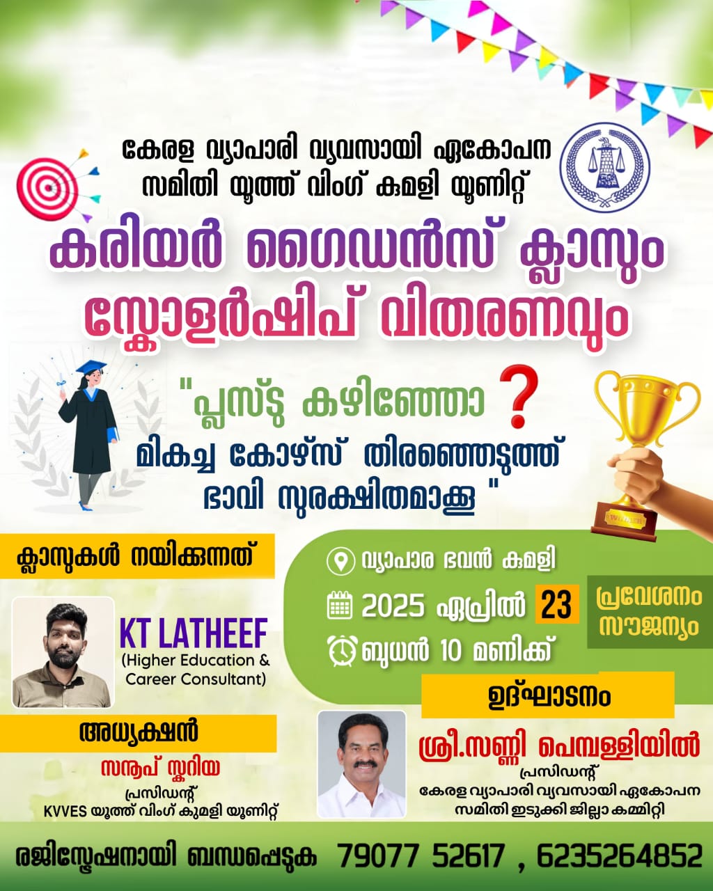 23 – 04-2025 ബുധനാഴ്ച്ച രാവിലെ 10 മണി മുതൽ കുമളി വ്യാപാര ഫൈനൽ വച്ച് “കരിയർ ഗൈഡൻസ് സെമിനാറും, സ്കോളർഷിപ്പ് വിതണവും സംഘടിപ്പിക്കും.