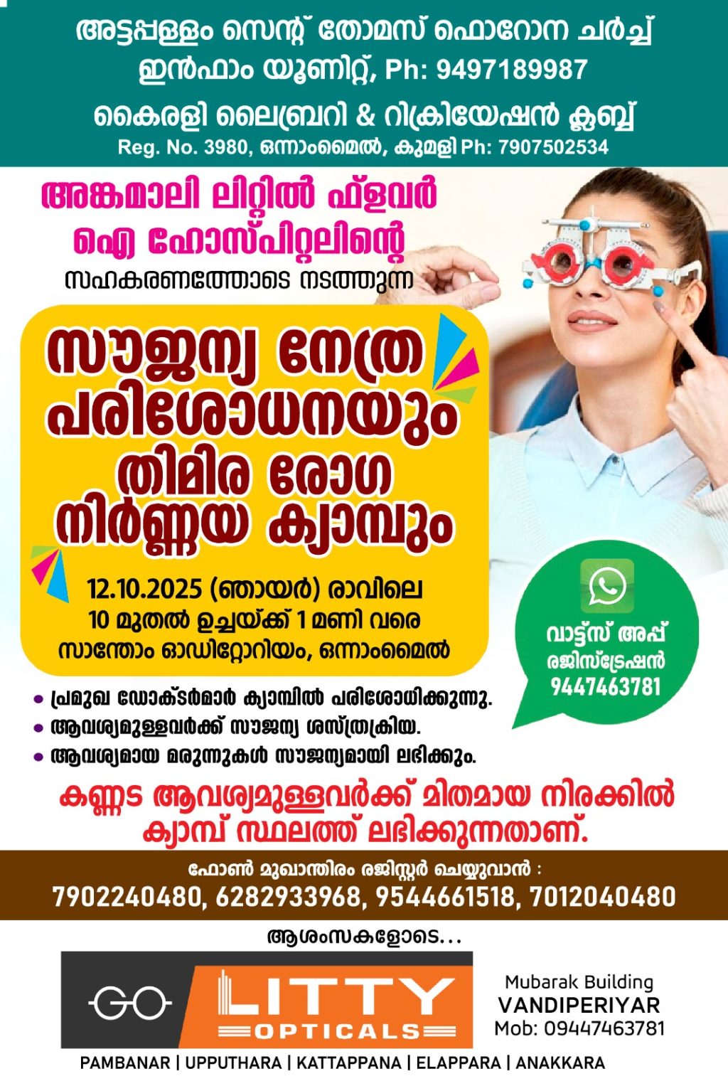 കുമളി : കണ്ണിന്റെ ആരോഗ്യം ഉറപ്പാക്കാനും, തിമിരം ഉൾപ്പെടെയുള്ള വിവിധ നേത്രരോഗങ്ങൾ നേരത്തേ കണ്ടെത്താനും ലക്ഷ്യമിട്ട്, അങ്കമാലി ലിറ്റിൽ ഫ്ലവർ കണ്ണാശുപത്രിയുടെ നേതൃത്വത്തിൽ സൗജന്യ മെഗാ നേത്ര പരിശോധനാ ക്യാമ്പ് സംഘടിപ്പിക്കുന്നു. അട്ടപ്പള്ളം സെൻറ് തോമസ് ഫൊറോന ചർച്ച് ഇൻഫാം യൂണിറ്റും കൈരളി ലൈബ്രറി & റിക്രിയേഷൻ ക്ലബ്ബും, വണ്ടിപ്പെരിയാർ ലിറ്റി ഒപ്റ്റിക്കൽസും സംയുക്തമായി സംഘടിപ്പിക്കുന്ന ഈ ക്യാമ്പ് 2025 ഒക്ടോബർ 12-ന് ഞായറാഴ്ച, രാവിലെ 9.30 മുതൽ ഉച്ചയ്ക്ക് 1 മണിവരെ, ഒന്നാം മൈലിലുള്ള സാന്തോം ഓഡിറ്റോറിയത്തിൽ വച്ച് നടത്തപ്പെടും.